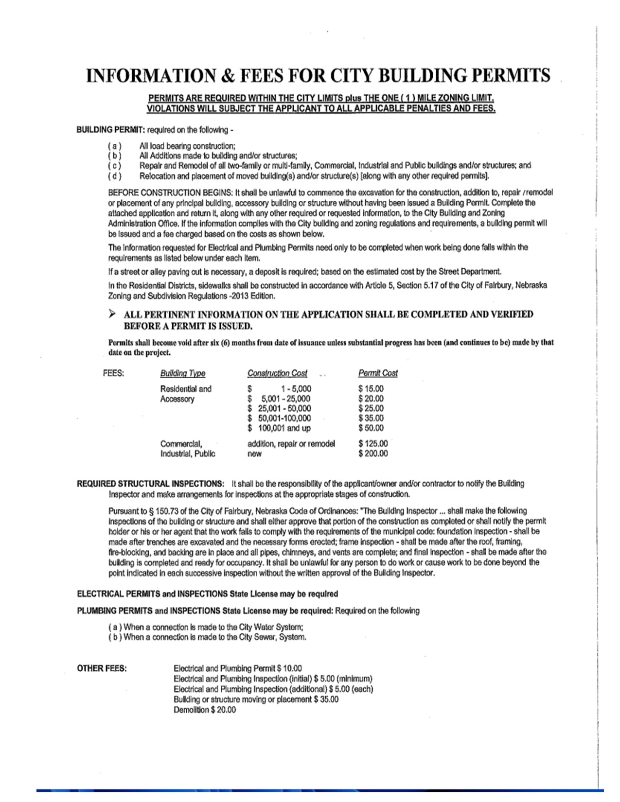 I swear to the best of my knowledge that the information here given and any attached materials are true and complete and that the work done will be in accordance with the Fairbury Municipal Code, the Zoning and Subdivision Regulations, and the adopted Building, Fire, Electrical and Plumbing Codes.